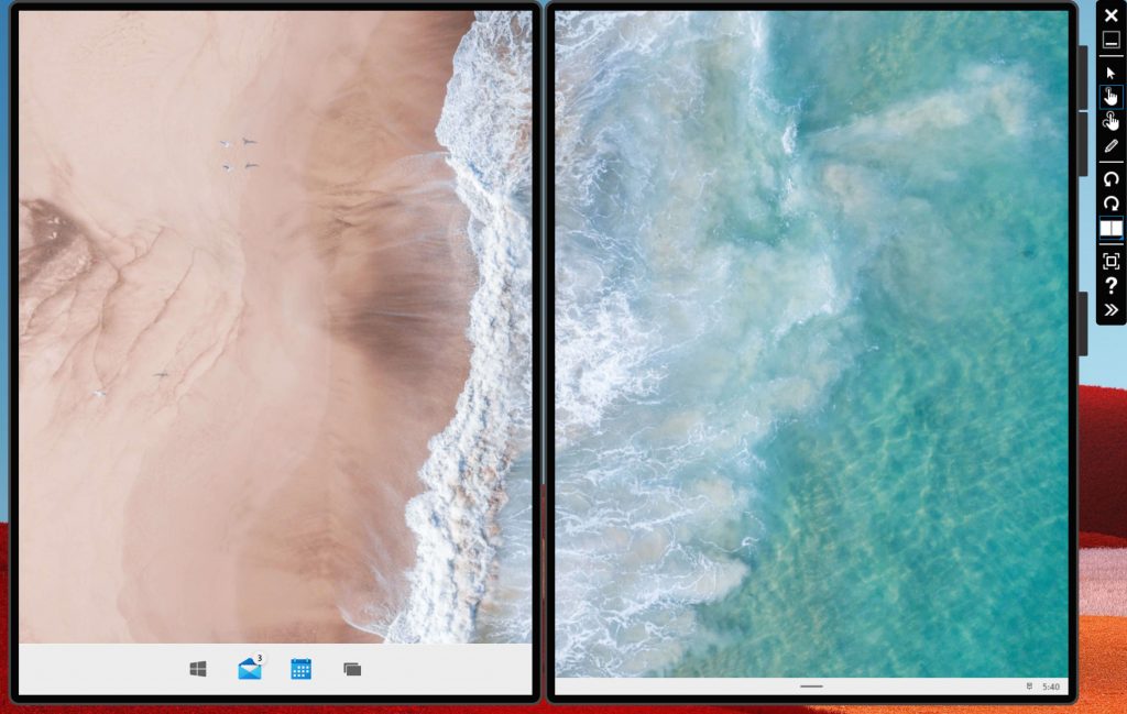 Мы продемонстрируем вам работу Windows 10X на компьютере Microsoft Surface Book 2. Это виртуальная машина, которая эмулирует двойные экраны. Итак, в нижней части каждого дисплея расположена панель задач, но когда мы будем использовать реальное устройство в режиме планшета, я думаю, панель задач будет минимизироваться, потому что вам не нужно видеть ее постоянно.