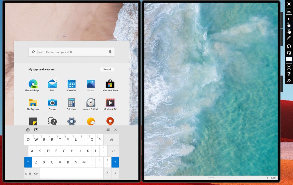 Кроме того, на некоторых устройствах у вас будет настоящий аксессуар, который вы можете положить поверх второго экрана для набора текста, но пока, нам придется использовать виртуальную клавиатуру. Теперь, если мы посмотрим на панель задач, то она больше не свернута по умолчанию и все иконки отображаются так же, как в Windows 10, поскольку сейчас мы используем трекпад и клавиатуру в качестве основного устройства ввода.
