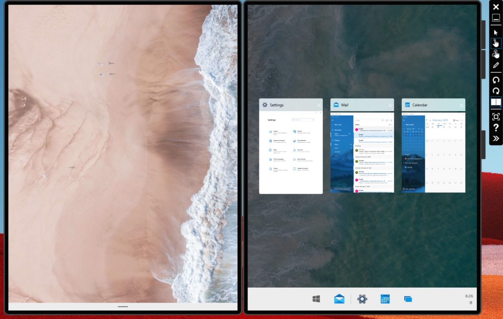 Так что это только один пример того, как использование устройства с двумя экранами в Windows 10X позволяет вам работать более эффективно, используя два экрана. Вы можете видеть больше одновременно на двух экранах, но это, конечно, не единственная причина, по которой вам может потребоваться использовать два экрана. На мой взгляд разделение экранов больше подходит для многозадачности, давайте вернем почтовое приложение на левый экран и откроем приложение календарь на правом экране.