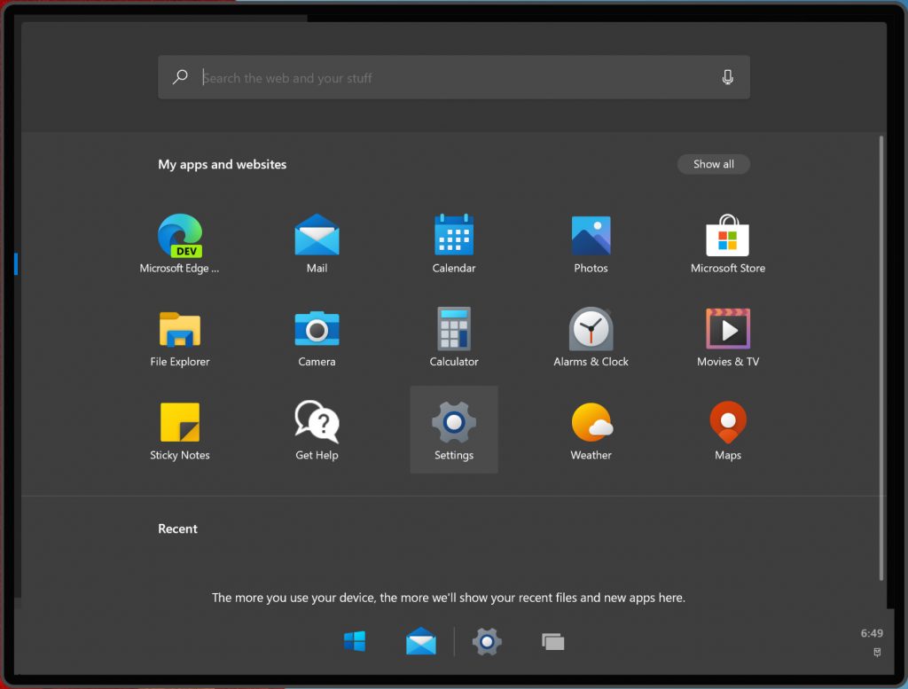 Конечно, Windows 10X поддерживает темный режим, и он выглядит неплохо, так что мы можем изменить нашу тему на темную, и это изменит панель задач и меню «Пуск», чтобы они соответствовали темному режиму. Мы видим, как меню пуск выглядит в темном режиме, а центр действий еще не имеет темного режима в этой сборке.