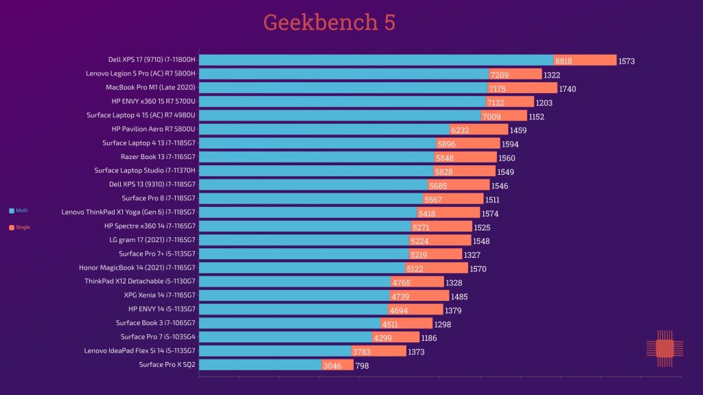 Действительно, даже в тесте Cinebench 23, который является полностью процессорным, Surface Pro 8 лидирует в группе аналогичных ноутбуков с тем же процессором Core i7-1185G7, подтверждая, что Microsoft проделал сумасшедшую работу с новым тепловым дизайном (Pro 8 также намного опережает Surface Book 3. с процессором i7 10-го поколения). Точно так же в тесте Geekbench 5 Surface Pro 8 находится в диапазоне превосходных Razer Book 13 и Dell XPS 13 (9310).
