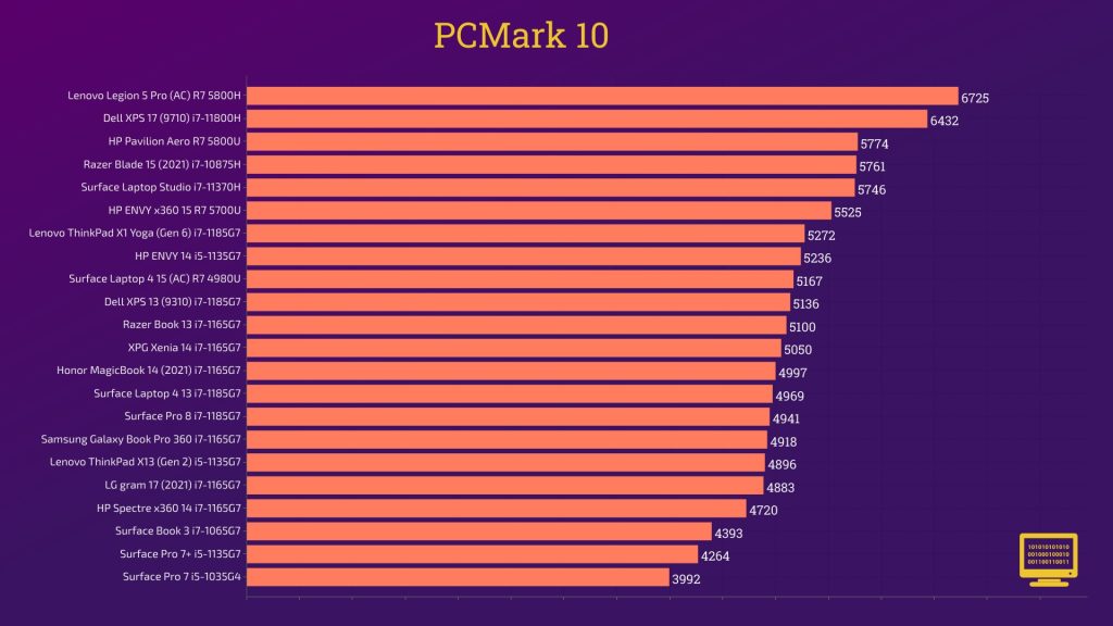 Несмотря на то, что Surface Pro 8 более ограничен по возможностям охлаждения (меньший корпус с более плотной компоновкой), производительность Surface Pro 8 с i7 соответствует Surface Laptop 4 (13 дюймов) с тем же Core i7 в тесте PCMark 10, который измеряет общую производительность системы с использованием сочетания CPU и GPU. Это очень хорошо, поскольку в прошлом Surface Pro изо всех сил пытались конкурировать по производительности с более традиционными ноутбуками.