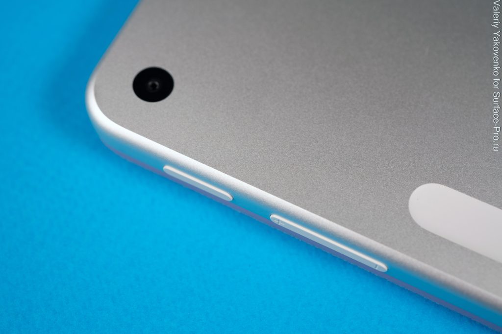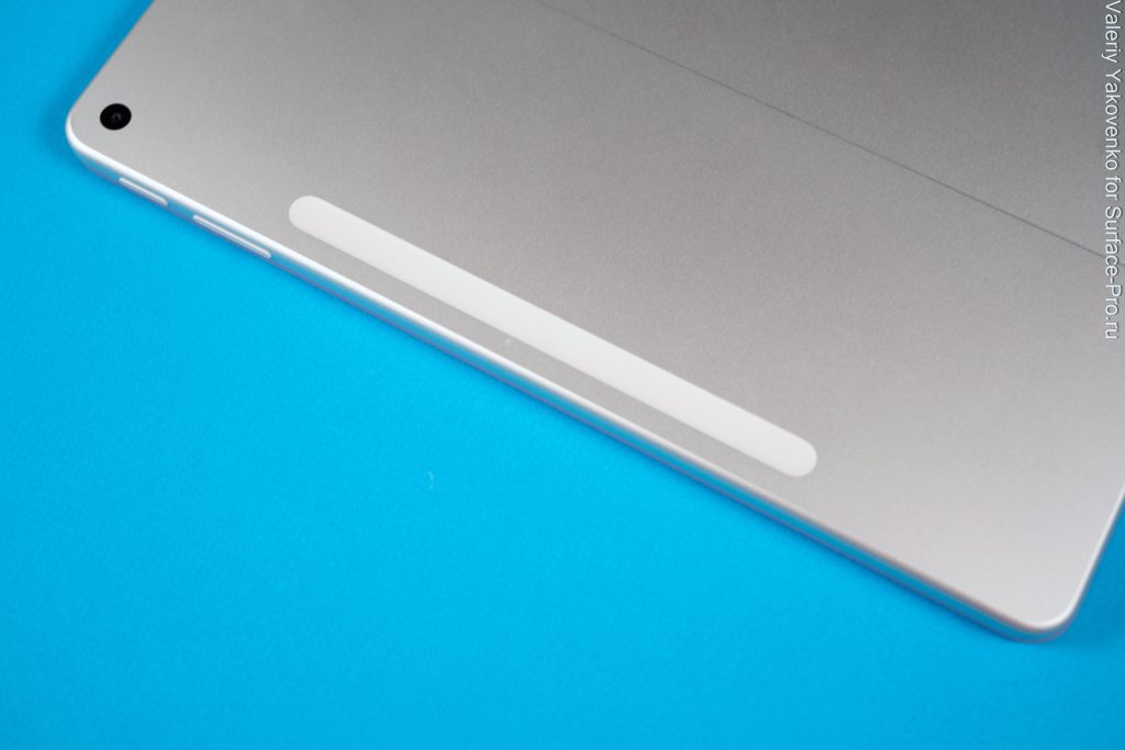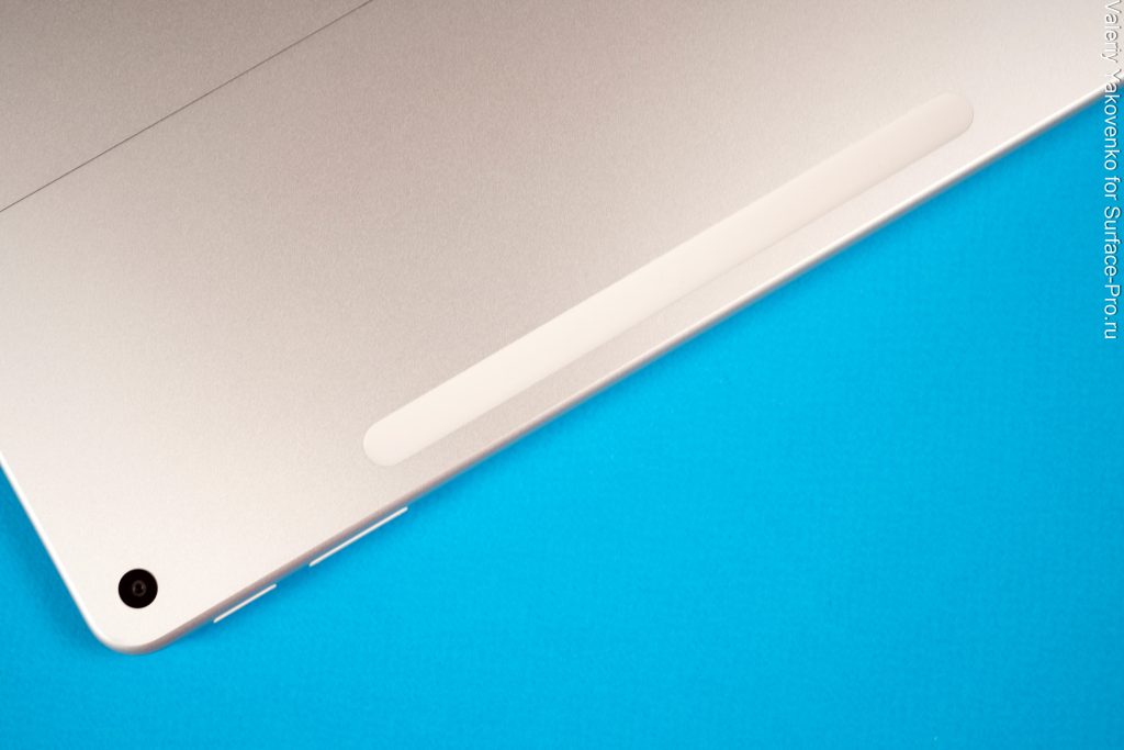 На задней панели также находится гнездо для зарядки Slim Pen, слегка утопленное и неметаллическое (но оснащенное сильными магнитами). Некоторые жаловались, что без стилуса оно выглядит странно, но, поскольку оно идеально расположено по центру и имеет вытянутую овальную форму, это может сойти за дизайнерское, а не функциональное решение. Поэтому, на мой взгляд, без стилуса он выглядит тоже вполне нормально.