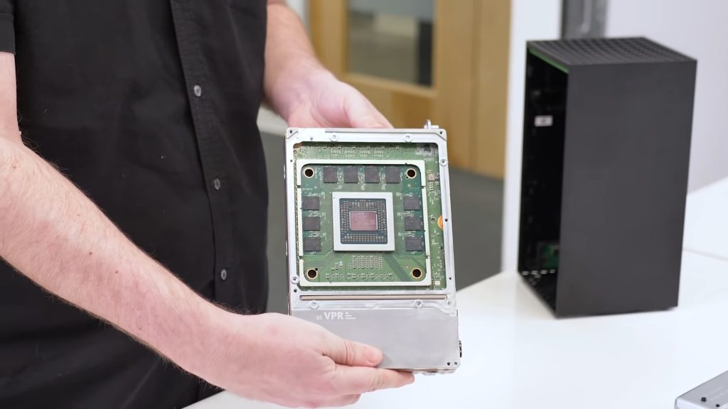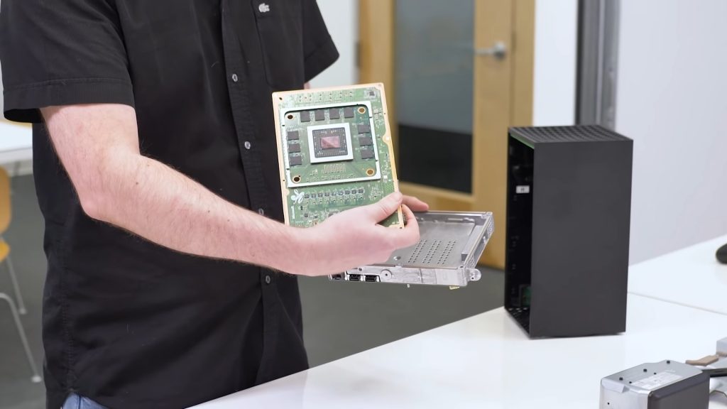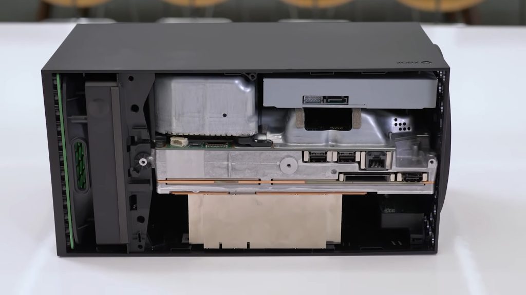 Конструкция Xbox Series X разрабатывалась для максимально эффективного отвода тепла. Она построена вокруг шасси-радиатора из сплошной алюминиевой отливки, как и Mac Pro 2013 года — холодный воздух втягивается снизу и выходит через через вентилятор сверху. Microsoft разделил системную плату на две части. Справа на одной плате размещаются компоненты высокой мощности, такие как процессор, оперативная память. На другой, слева, находится плата южного моста, отвечающая за ввод и вывод данных. Платы располагаются по обеим сторонам массивного блока шасси — сплошной алюминиевой отливки.