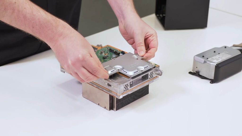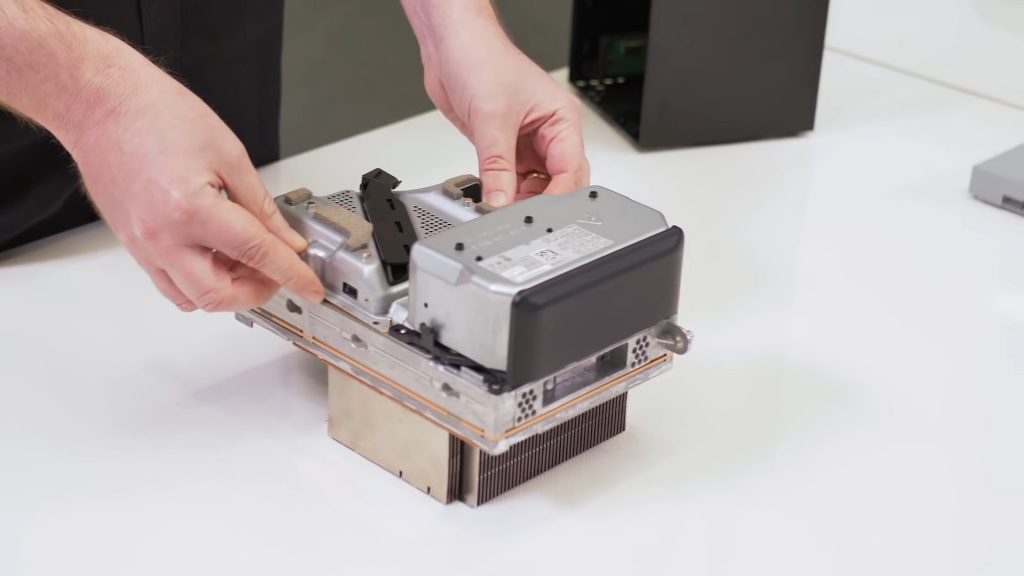 В левой части консоли также расположен привод Blu-ray и блок питания мощностью 315 Вт с элементами электрического экранирования. В отличие от предыдущих консолей Microsoft, у нового Xbox нет металлической внешней экранировки. В этом баланс конструкции. По сути, компьютер должен сдерживать электромагнитное излучение, но в то же время Xbox Series X должен рассеивать много тепла.
