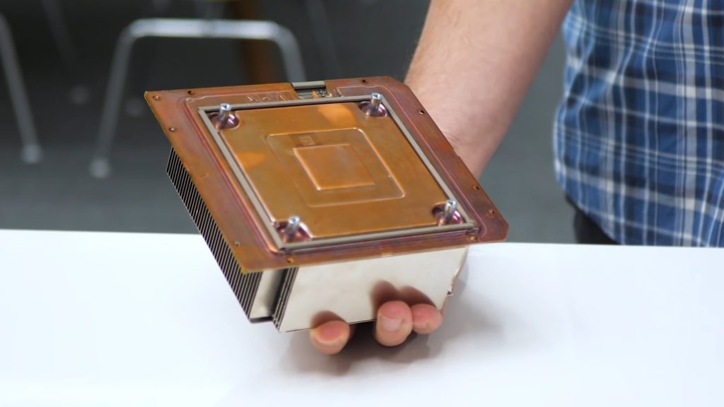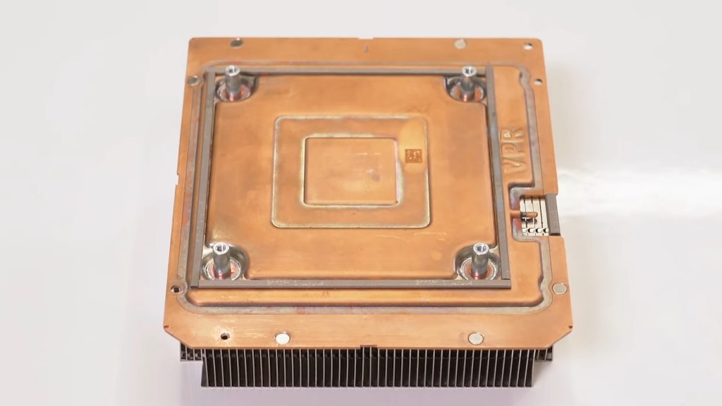 Один из самых больших отдельных компонентов во всей конструкции — радиатор. Условно говоря, это довольно большая тяжелая медная испарительная камера с прикрепленным к ней легким алюминиевым радиатором. Он достаточно большой, чтобы покрыть большую часть платы SoC, но он не просто отводит тепло от основного процессора. Он также охлаждает память GDDR6.
