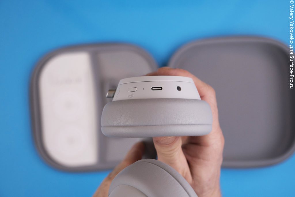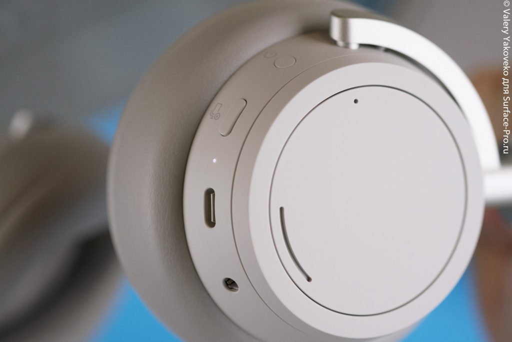 На правом амбушюре Surface Headphones, внизу расположены кнопки включения наушников и выключения микрофона. Там-же находится небольшой белый светодиодный индикатор, который мигает при зарядке и горит постоянно, когда зарядка завершена, порт USB Type-C для быстрой зарядки и аудиоразъем 3,5 мм для тех, кто хочет использовать проводное подключение.
